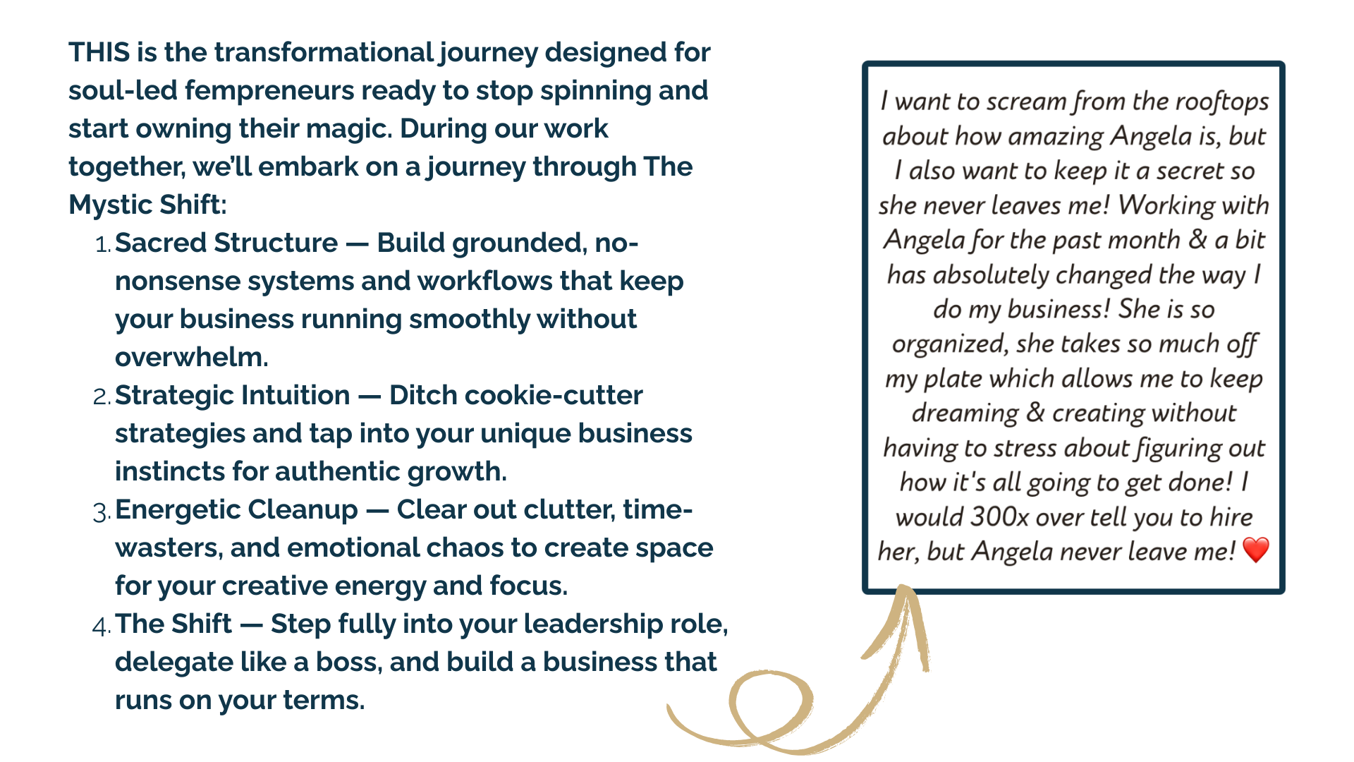 6. Energetic Shift + Calm Confidence – With systems, structure, and strategy handled, you finally release the stress and step into grounded leadership.